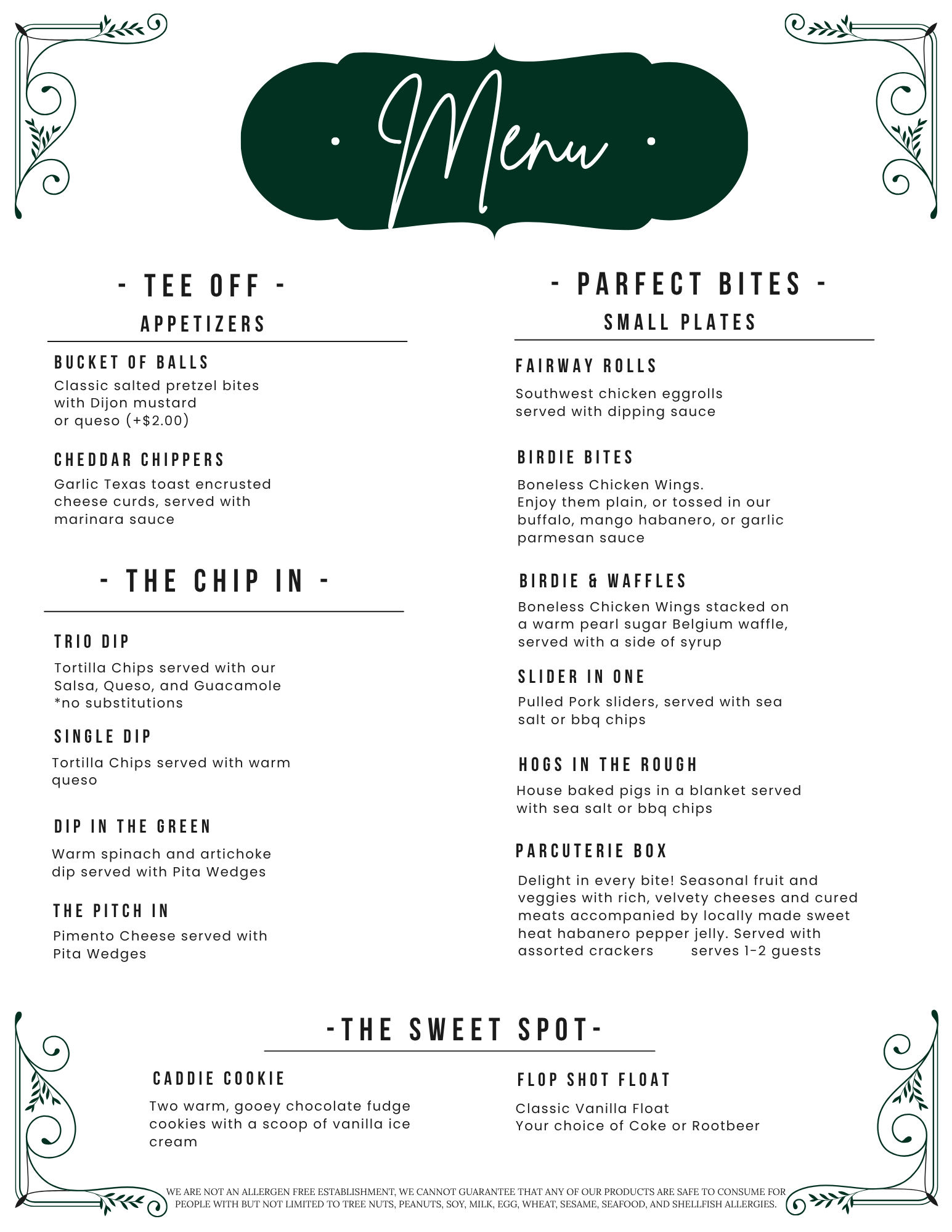 From first bites to final putts, our menu is designed to keep you fueled and satisfied. Enjoy shareable starters, hearty small plates, and handcrafted boards — all made to pair perfectly with your favorite drink.